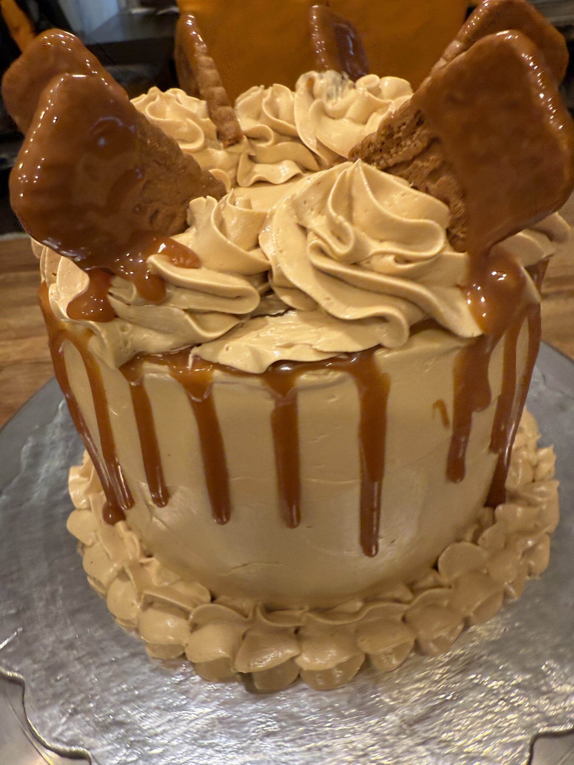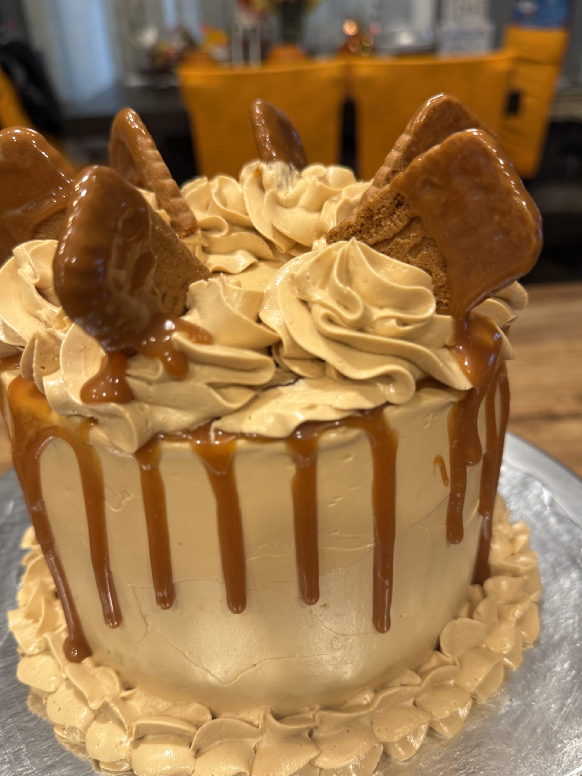 A light and fluffy yellow sponge cake topped with rich caramel buttercream and a drizzle of salted caramel.