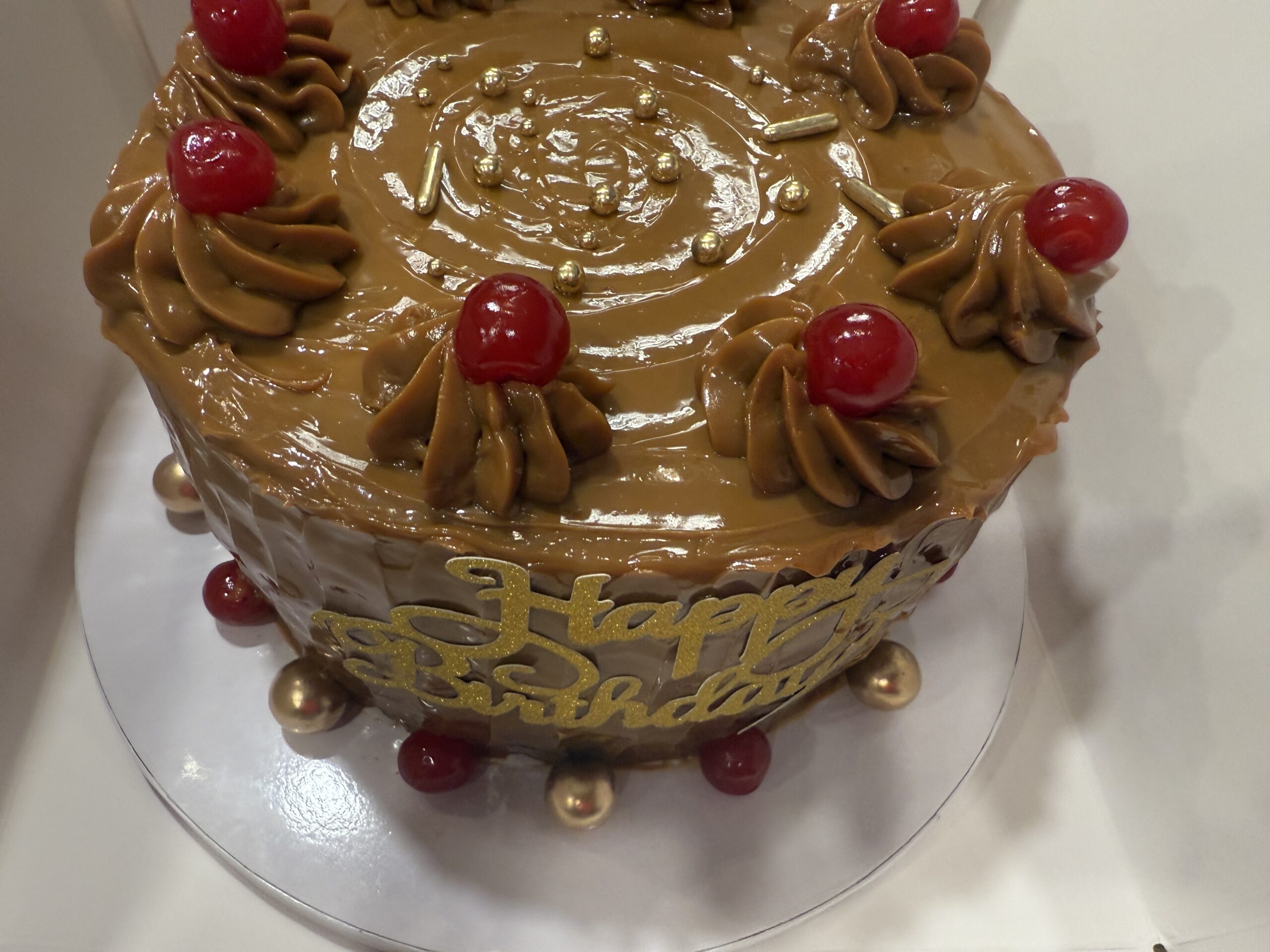 Moist and delicious Belizean style white layered cake frosted with creamy and decadent caramel and topped with cherries or nuts.