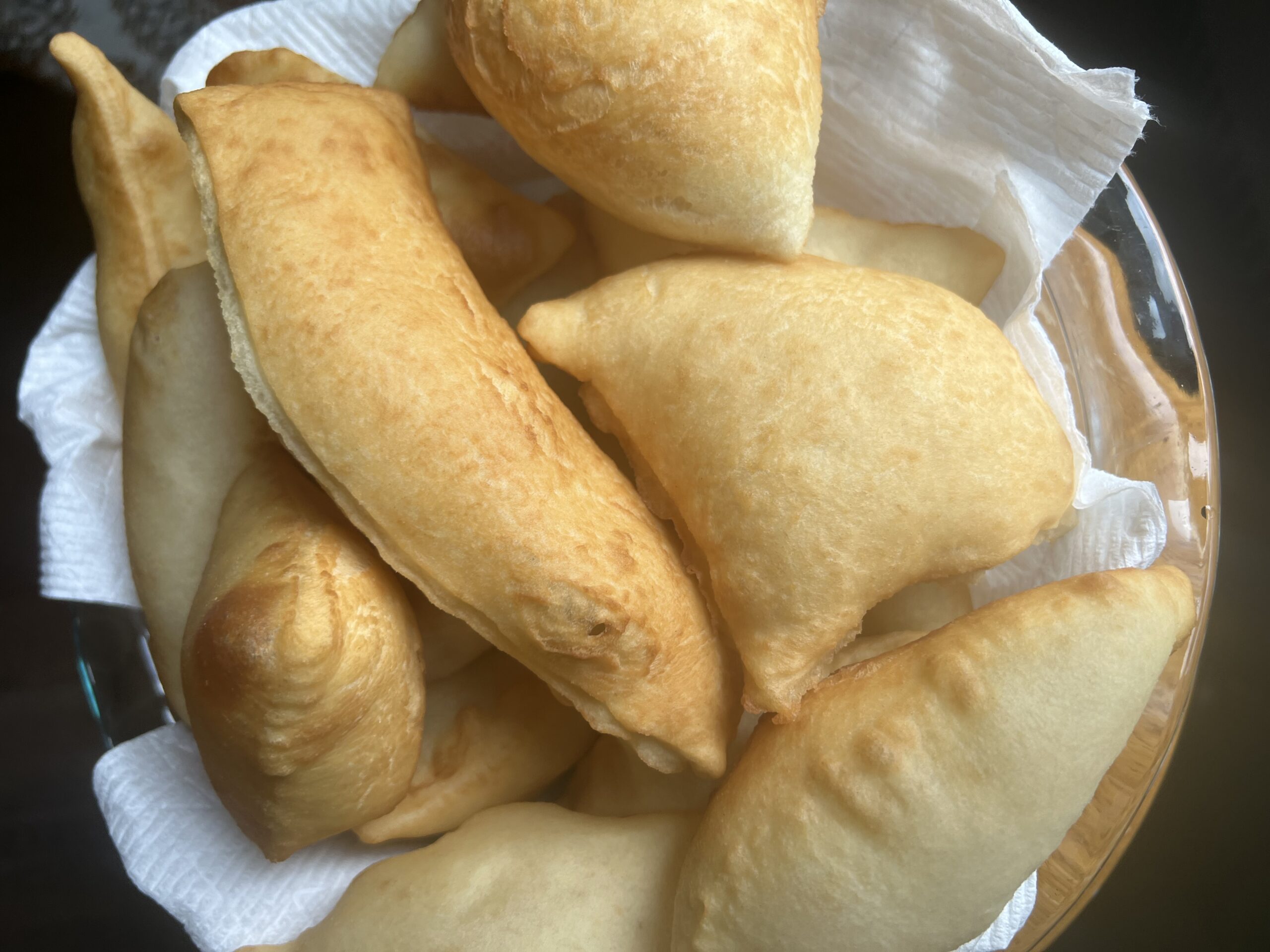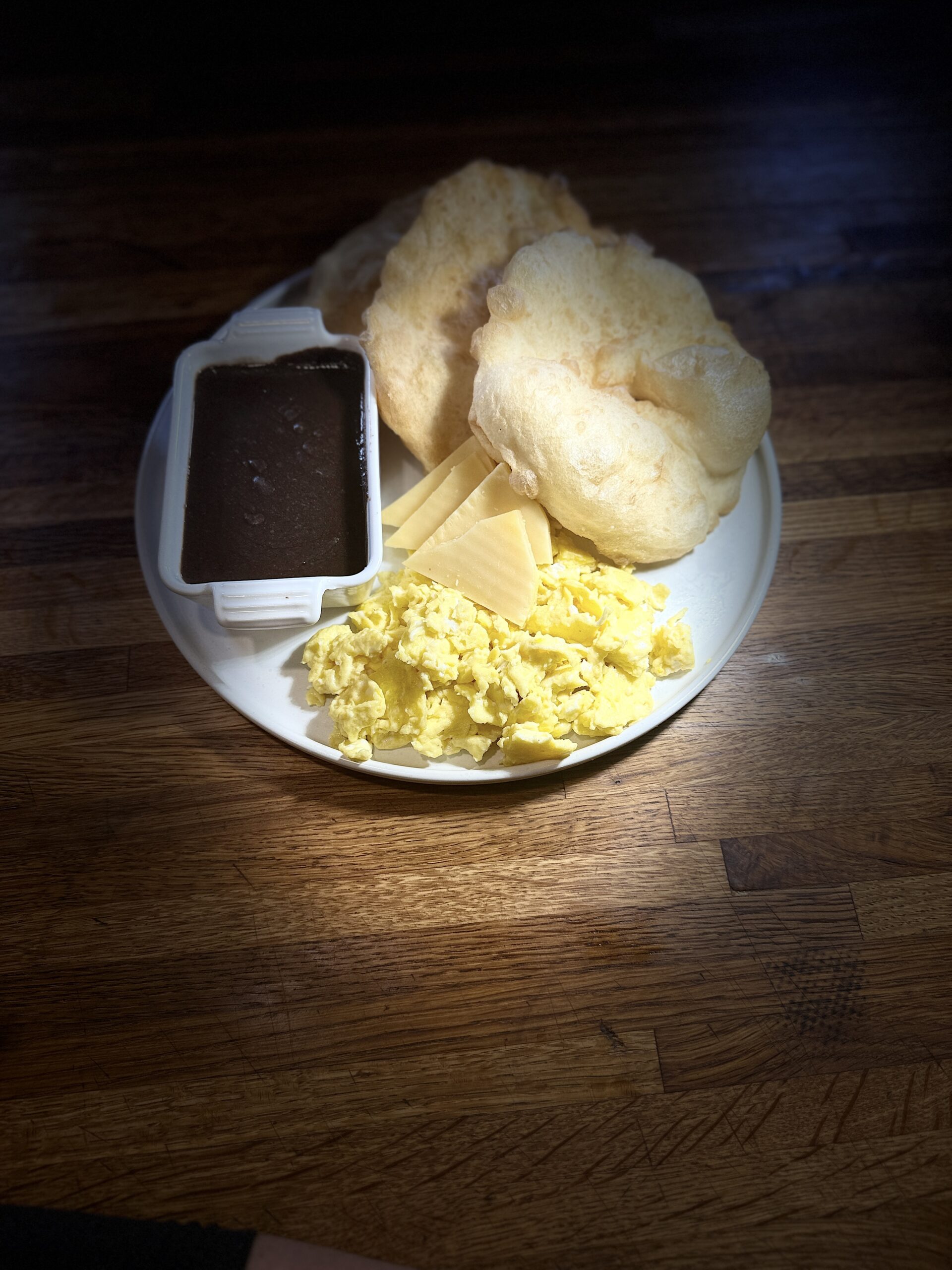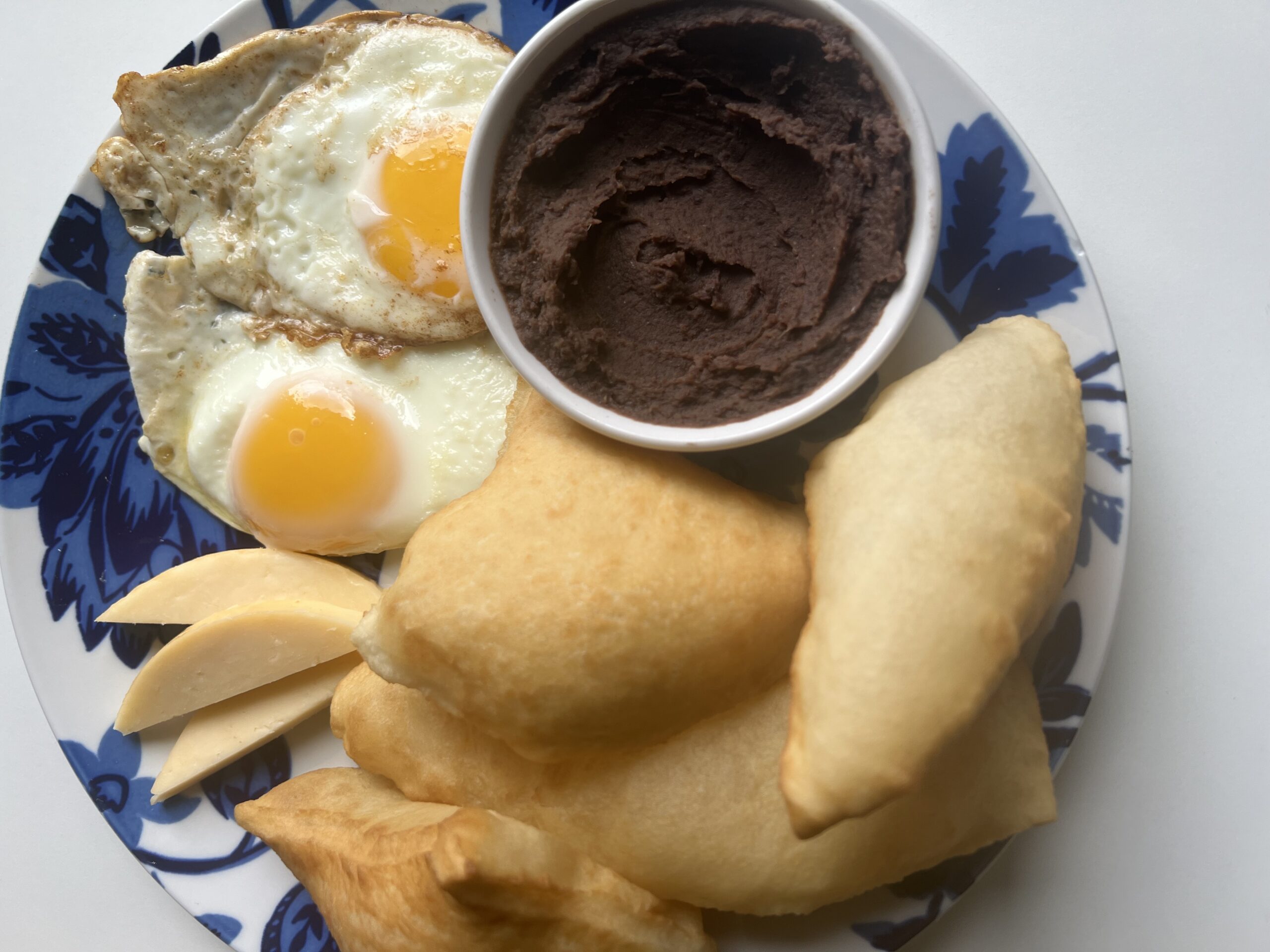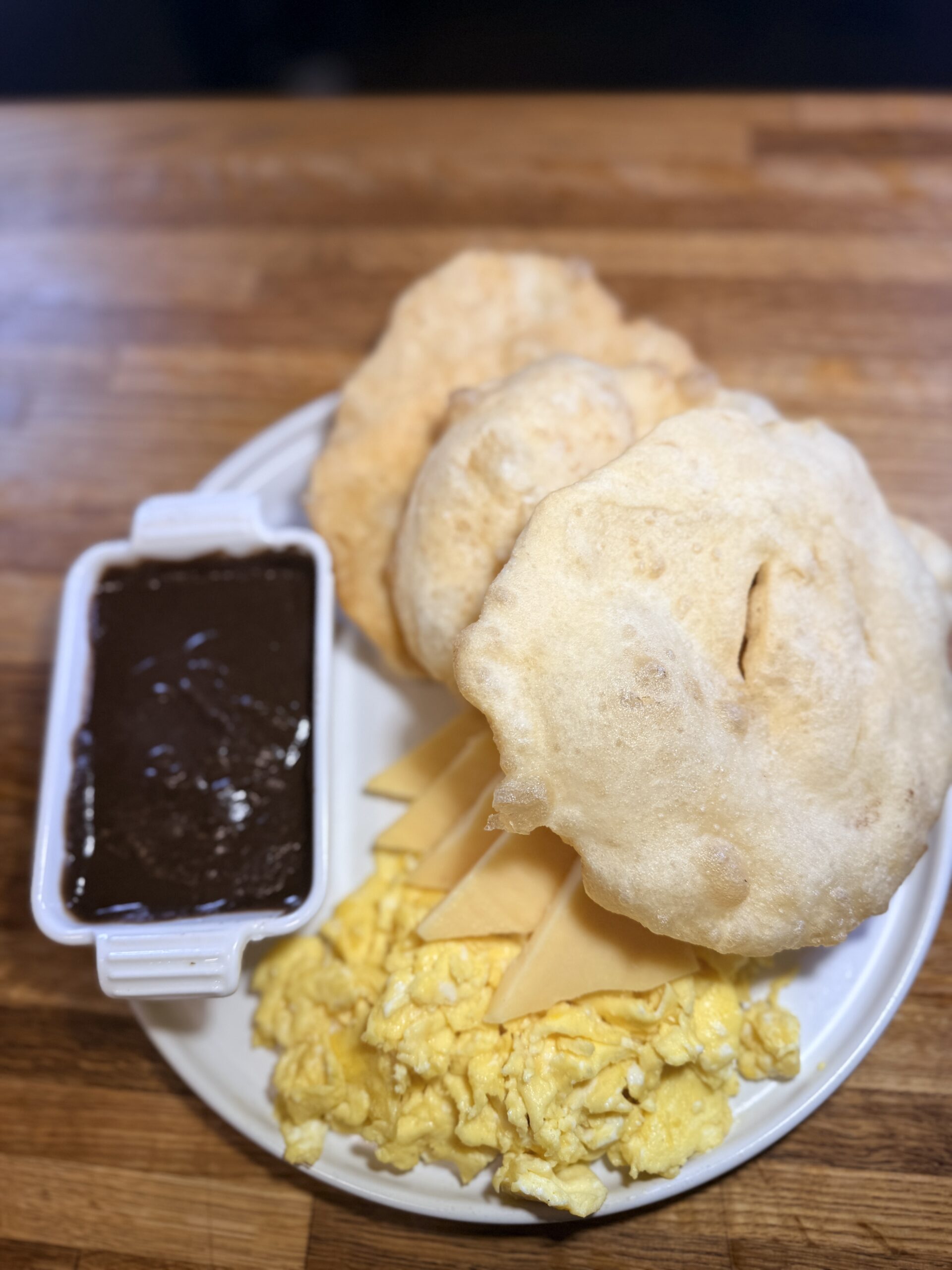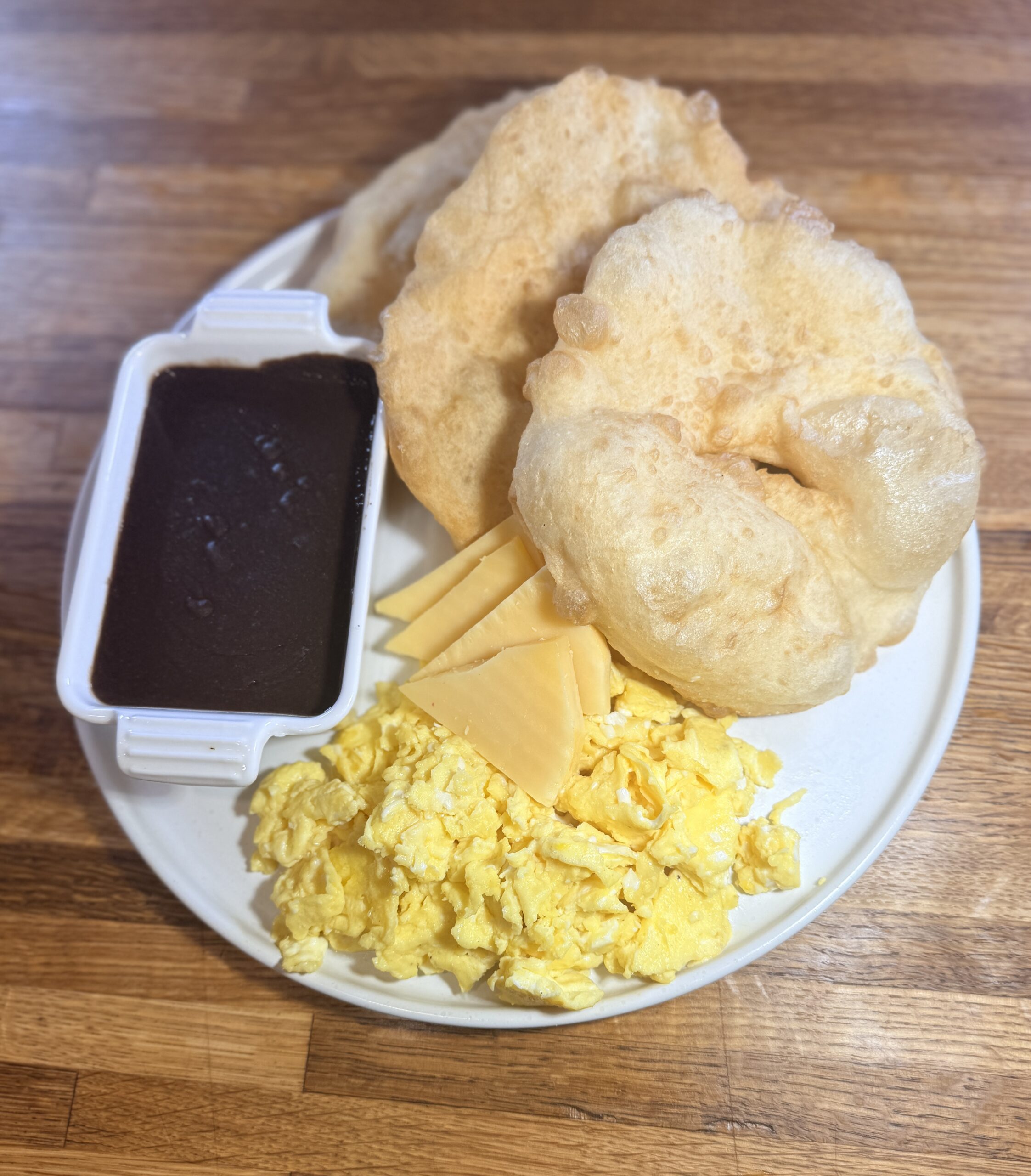 Each plate includes golden, pillowy fried jacks, creamy refried beans, and cheese, served with your choice of scrambled eggs or stew chicken or both.